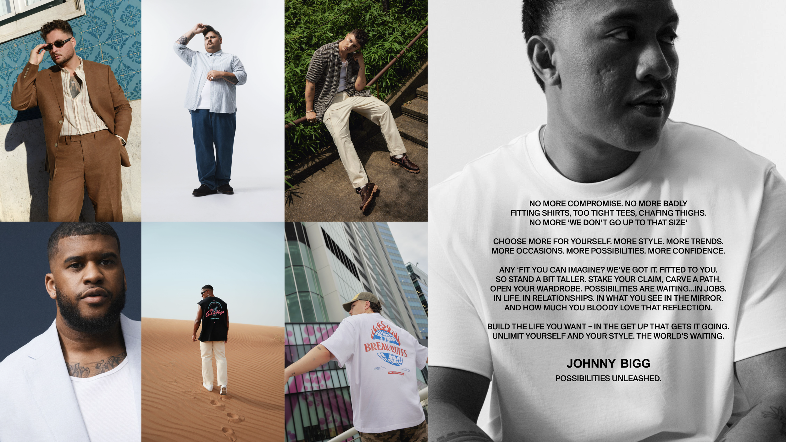 Established in 2014, Johnny Bigg has since (accidentally) aged up. Creating sharp outfitting for XL–10XL guys, it had an opportunity to grab the attention of the XL–3XL guys who didn’t think it was for them — and the 18–28 year olds who thought it was for their dad. An extensive repositioning, new platform, brand world and sharper fit messaging is helping show guys that the possibilities they want in wardrobes — and in life — sit with Johnny Bigg.